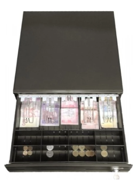Оснащён зажимами для купюр, выполненными из металла, надёжным роликовым механизмом и 3-х секционным ключом, предполагающим электронное и ручное открытие, а также блокировку ящика.